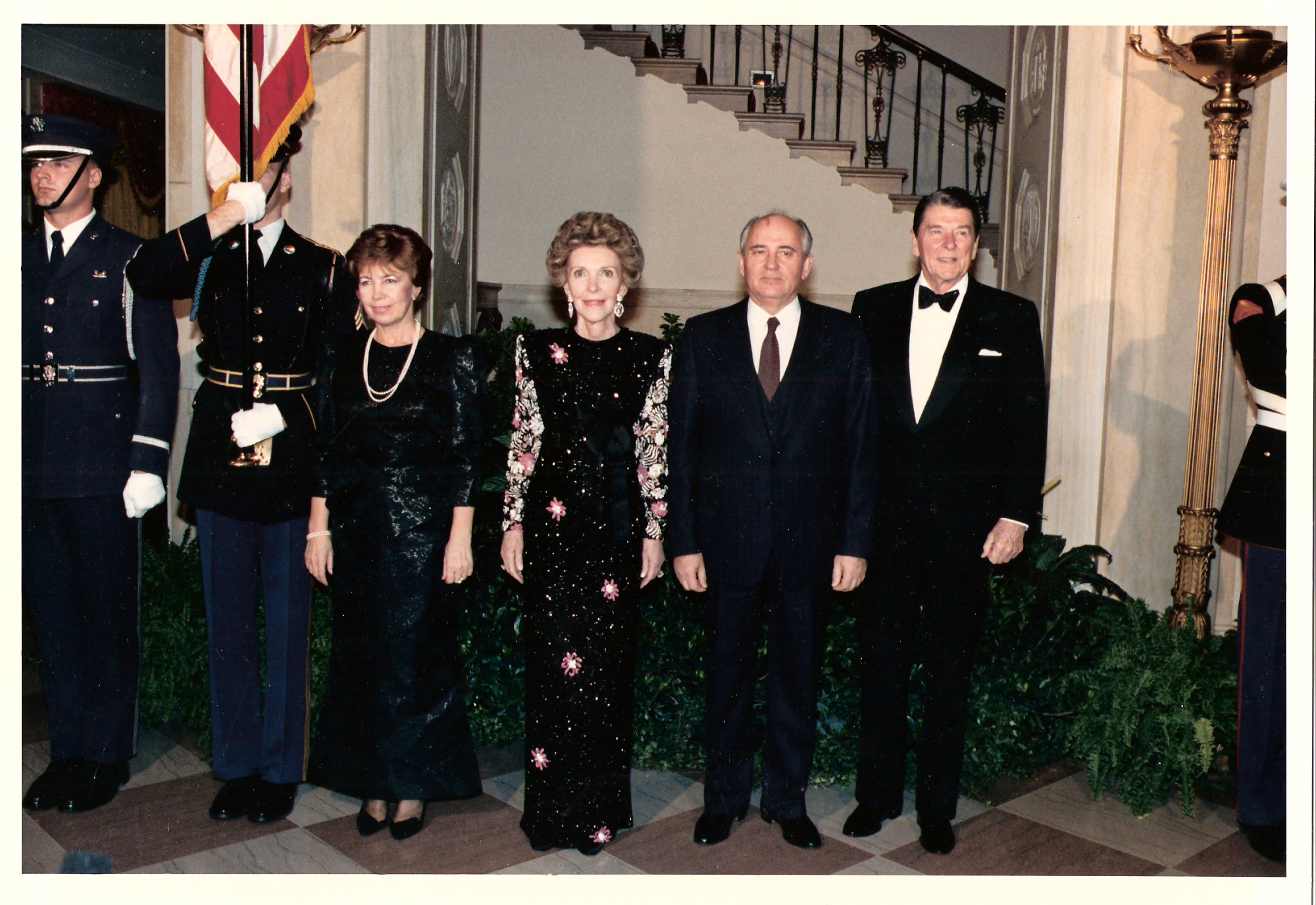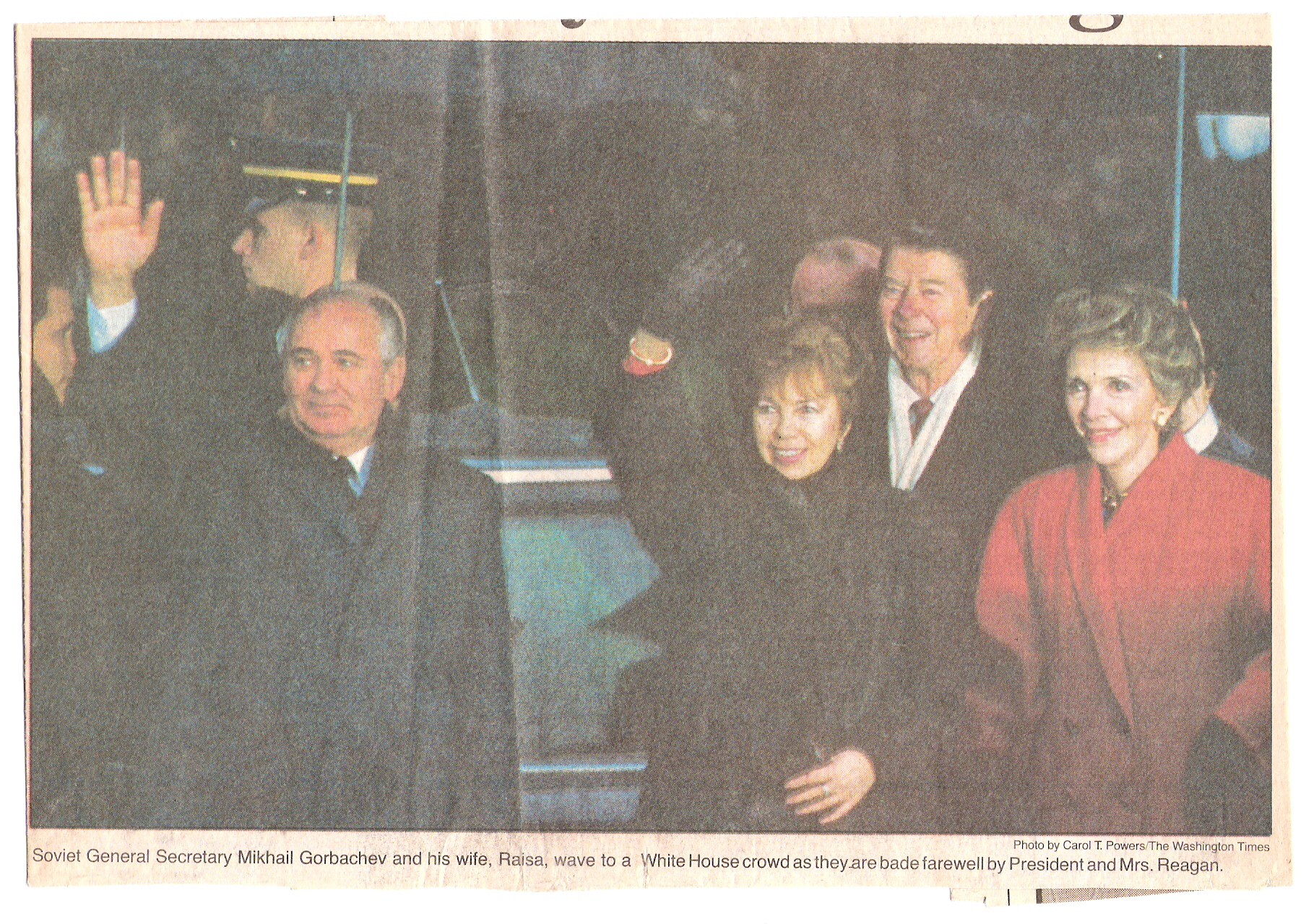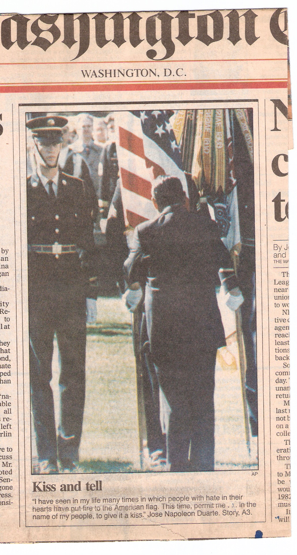 This photo is from the front page of The Washington Times on October 15, 1987. It was taken on the front lawn of the White House during the full-honor arrival ceremony for El Salvador's Jose Napolean Duarte. I am holding the American flag.